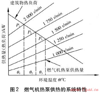 燃?xì)鈾C(jī)熱泵供熱的系統(tǒng)特性見圖2,顯示了燃?xì)鈾C(jī)在不同轉(zhuǎn)速時,熱泵能提供的供熱量與建筑物在不同環(huán)境溫度下所需熱負(fù)荷之間的關(guān)系。假設(shè)在滿足建筑物最大熱負(fù)荷(即壓縮機(jī)最大負(fù)荷,P1點(diǎn))條件下確定傳動比,此時燃?xì)鈾C(jī)具有最好的經(jīng)濟(jì)性,即燃?xì)鈾C(jī)工作在經(jīng)濟(jì)轉(zhuǎn)速區(qū)間內(nèi),熱泵的其他工作狀態(tài)點(diǎn)(P2,P3等點(diǎn))也都唯一確定。而實(shí)際E燃?xì)鈾C(jī)熱泵大部分時間都處于部分負(fù)荷運(yùn)行狀態(tài),最大負(fù)荷運(yùn)行時間不超過總運(yùn)行時間的10%。因此當(dāng)機(jī)組處于部分負(fù)荷運(yùn)行狀態(tài)時,以最大負(fù)荷工況確定的傳動比將使燃?xì)鈾C(jī)低效率運(yùn)行,燃料消耗量大,全年運(yùn)行經(jīng)濟(jì)性差。因此單級傳動比是以犧牲燃?xì)鈾C(jī)的經(jīng)濟(jì)性為代價來滿足壓縮機(jī)的動力性要求,且當(dāng)建筑物熱負(fù)荷變化范圍較大時,燃?xì)鈾C(jī)在低速、低負(fù)荷狀態(tài)下工作時,可能會出現(xiàn)燃?xì)鈾C(jī)效率過低的問題。因此,這種方案并不理想。