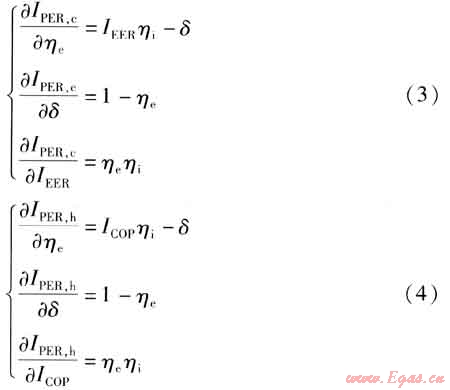 由式(1)、(2)可知,燃?xì)鈾C(jī)熱泵的一次能源利用率與熱泵的性能系數(shù)、燃?xì)鈾C(jī)的熱效率及余熱回收系數(shù)有關(guān),各因素對PER的影響程度不同。IPER,c、IPER,h分別對ηe、IEER或ICOP求偏導(dǎo),得: