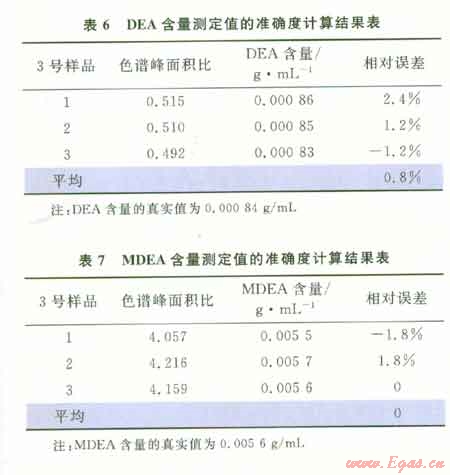由表4和表5可以看出DEA含量測定值的相對偏差是1.9%,MDEA含量測定值的相對偏差是0.5%,表明該方法精密度較高。