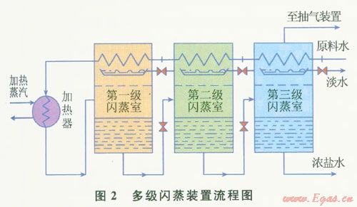 煤層氣產(chǎn)出水蒸餾脫鹽處理裝置的基本原理就是加熱煤層氣產(chǎn)出水,使之產(chǎn)生大量蒸汽并進(jìn)行氣液分離。同時,利用原料水為分離出的蒸汽進(jìn)行冷卻。