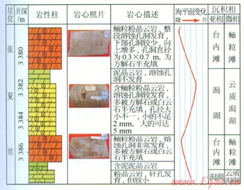 度較正常海水偏高。沉積物主要為褐灰、灰、淺灰色薄―中層狀泥質(zhì)白云巖、灰質(zhì)白云巖、泥晶白云巖、亮晶鮞粒白云巖等(圖1);根據(jù)沉積物可進(jìn)一步劃分潟湖和臺(tái)內(nèi)灘,臺(tái)內(nèi)灘以鮞粒灘為主,巖性主要為淺灰色亮晶鮞粒(粉晶)白云巖,受后期溶蝕作用影響往往形成較好的儲(chǔ)集層(圖1)。