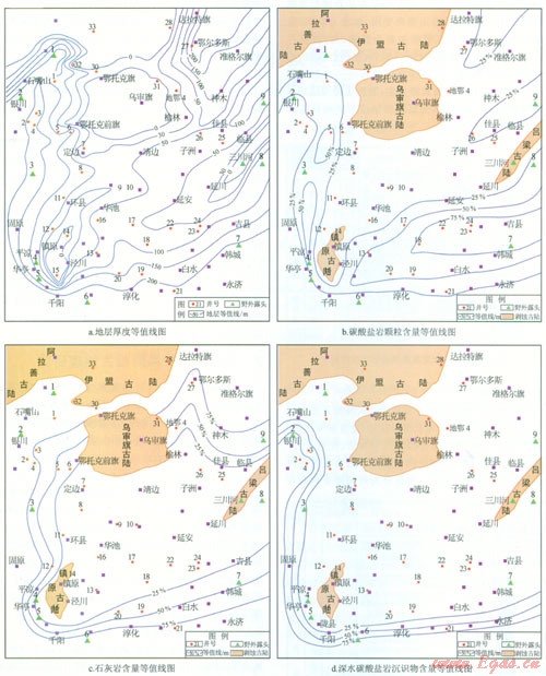 本文中深水碳酸鹽巖沉積物主要指深灰、灰黑色泥灰?guī)r、含泥灰?guī)r及泥晶灰?guī)r,其顏色較深,顆粒細(xì)小,代表較深水沉積環(huán)境。通過(guò)50余口鉆井及10條野外露頭剖面統(tǒng)計(jì),繪制了鄂爾多斯盆地深水碳酸鹽巖沉積物含量分布圖(圖3一d),其含量大于50%的主要分布在銀川-固原-千陽(yáng)-淳化-永濟(jì)一線外圍,多超盆地范圍,盆地內(nèi)深水碳酸鹽巖沉積物含量基本小于25%。