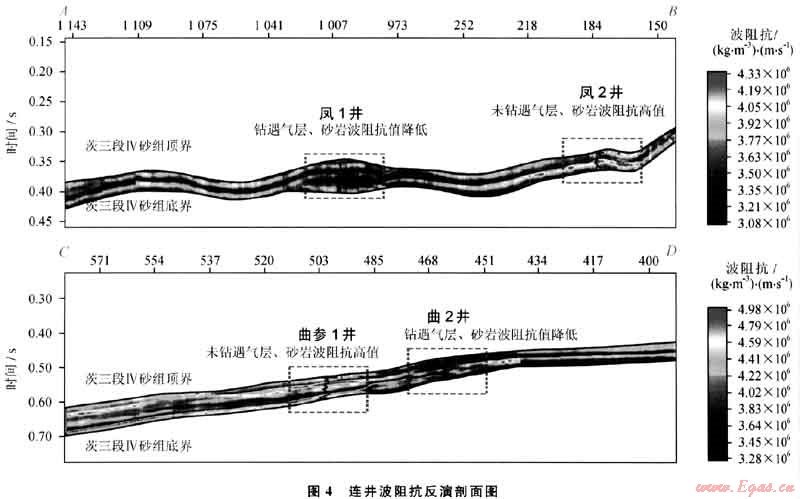 為了對(duì)含氣地層的波阻抗特征進(jìn)行分析,選取7兩條連井剖面(剖面位置見(jiàn)圖1)AB和CD來(lái)進(jìn)行對(duì)比,其波阻抗值特征如圖4所示。其中,AB剖面過(guò)鳳1井和鳳2井,鳳1井在目的層段發(fā)現(xiàn)氣層,CD剖面過(guò)曲參1井和曲2井,曲2井在目的層段鉆遇氣層,其他兩口井在茨營(yíng)組三段Ⅳ砂組為不含氣砂巖地層。