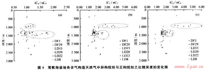 同水溶相天然氣“甲烷化”的原理一樣,由于異構(gòu)烷烴的溶解度大于正構(gòu)烷烴[6],水溶氣出溶后異構(gòu)烷與正構(gòu)烷的比值增加。從研究區(qū)煤系熱成因氣樣品異構(gòu)烷烴與正構(gòu)烷烴比值隨深度的變化規(guī)律可以看出(圖4):隨著深度的變淺,iC4/nC4、iC5/nC5和iC6/nC6都具有較明顯地增加趨勢(shì),在1500~2000m深度處若干比值出現(xiàn)異常的增大。結(jié)合本區(qū)實(shí)際地質(zhì)情況,在1500~2000m深度正是本區(qū)由超壓帶向常壓帶過(guò)渡的區(qū)域,因此認(rèn)為由于在該深度溫度、壓力的急劇降低導(dǎo)致天然氣在水中的溶解度降低,水溶相天然氣達(dá)到過(guò)飽和而出溶,從而使得出溶的天然氣異構(gòu)烷烴異常富集。