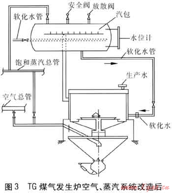 飽和溫度波動大的原因,除了工藝設(shè)備的因素外,還有人為控制因素。因此,既要從工藝設(shè)備的改造方面入手,還要考慮消除人為因素。我們在不否定TG爐本身優(yōu)點(diǎn)的前提下,認(rèn)真分析了該廠原有3Aд-21煤氣發(fā)生爐爐況較易控制,并能長期穩(wěn)定運(yùn)行的原因[3~6]。認(rèn)為3Aд-21煤氣發(fā)生爐的優(yōu)點(diǎn)除了破渣能力較強(qiáng)的爐條外,其水套產(chǎn)生的飽和蒸汽經(jīng)汽包收集后再根據(jù)需要由飽和溫度調(diào)節(jié)閥控制使用的方法,值得借鑒。這也是從根本上解決TG爐飽和溫度波動大的行之有效的方法。為此,我們在韶關(guān)冶煉廠TG爐中選一臺爐做試驗。將TG爐的全水套在原結(jié)構(gòu)基礎(chǔ)上加寬100mm(總寬度達(dá)到200mm),并將水套分成爐頂水套和爐身水套,爐頂水套使用一般生產(chǎn)管網(wǎng)用水,只作為降低操作面溫度、改善工人的操作環(huán)境之用,爐身水套則使用軟化水,產(chǎn)生的飽和蒸汽收集到新設(shè)置的汽包。飽和蒸汽經(jīng)汽包的汽水分離器分離水分后,再按爐況需要控制送入空氣管充分混合供氣化之用(見圖3)。另外,將控制加料過程的溫度信號取自TG爐煤氣出口溫度。采取上述改造方案后效果非常好,TG爐工藝控制變得簡單穩(wěn)定,我們很快就將其他的8臺TG爐全部按此方法改造。