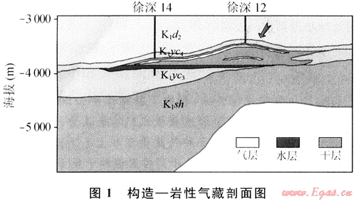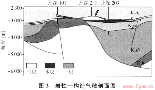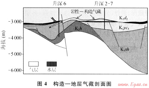 這種氣藏是在構(gòu)造背景下,由于地層發(fā)生尖滅或被剝蝕后,上部致密地層超覆形成天然氣藏,通??煞譃槲挥诘貙硬徽厦嬉陨虾筒徽厦嬉韵聝煞N。這種氣藏類型主要發(fā)育在徐家圍子斷陷地層被剝蝕地區(qū),在目前已鉆探井中,僅有升深6井(沙河子組砂礫巖)揭示為這種氣藏類型(圖4)。該氣藏位于兩個(gè)向斜之間的構(gòu)造高部位上,發(fā)育在營四段與沙河子組形成削蝕不整合面以下的沙河子組圈閉中。