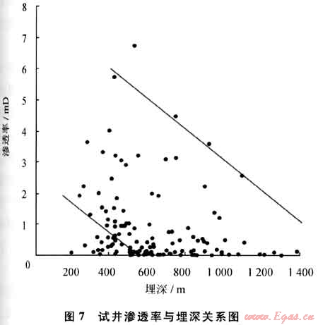 超低滲透儲層(滲透率小于0.1mD)占26.0%,低滲透儲層(滲透率介于0.1~1.0mD)占36.8%,中滲透儲層(滲透率介于1.0~5.0mD)占18.1%,高滲透儲層(滲透率大于5.0mD)占19.1%(圖6、表3)。試井滲透率總體隨埋深的增加而減少(圖7)。