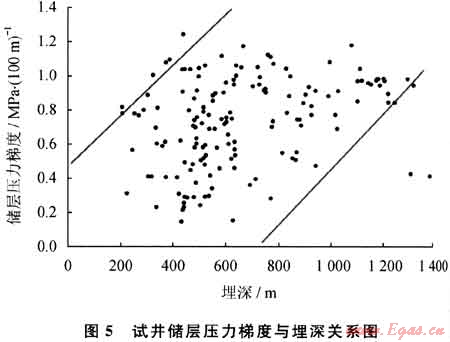 其中,嚴重欠壓儲層(儲層壓力梯度小于0.5MPa/100m)占21.2%,欠壓儲層(儲層壓力梯度介于0.5~0.75MPa/100m)占29.4%,略欠壓儲層(儲層壓力梯度介于0.75~0.90 MPa/100m)占18.8%,正常壓力儲層(儲層壓力梯度介于0.90~1.10MPa/100m)占27.1%,超壓儲層(儲層壓力梯度大于1.10MPa/100m)占3.5%(圖4)。儲層壓力梯度總體隨埋深的增加呈現(xiàn)出增大的趨勢(圖5)。