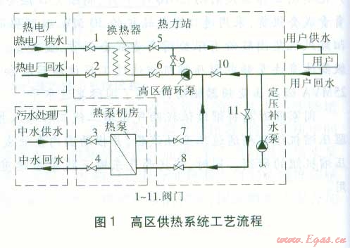 污水處理廠內(nèi)建有中水泵站l座,安裝3臺流量為625 m3h、揚程為40 m的循環(huán)泵,流量滿足熱泵需求,中水循環(huán)泵采用變頻調(diào)速(由供回水壓差控制)。將中水作為熱泵的低溫熱源,在小區(qū)內(nèi)建造熱泵機房1座。將熱泵作為基本熱源,承擔設(shè)計負荷的75%左右。熱電廠作為峰荷熱源,并在嚴寒期單獨運行。小區(qū)內(nèi)建熱力站4座,由于l8層建筑比較分散,因此在1~3號熱力站內(nèi)分別設(shè)置l套高區(qū)系統(tǒng)和l套低區(qū)系統(tǒng),4號熱力站只設(shè)置l套低區(qū)系統(tǒng)。高區(qū)、低區(qū)供熱系統(tǒng)的工藝流程分別見圖1、2。