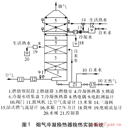 本實(shí)驗(yàn)臺(tái)是在普通燃?xì)鉄崴魃霞友b冷凝換熱器而成。實(shí)驗(yàn)系統(tǒng)由3部分組成:氣(包括天然氣、空氣、煙氣)系統(tǒng)、水系統(tǒng)和控制系統(tǒng)。實(shí)驗(yàn)系統(tǒng)見圖1。