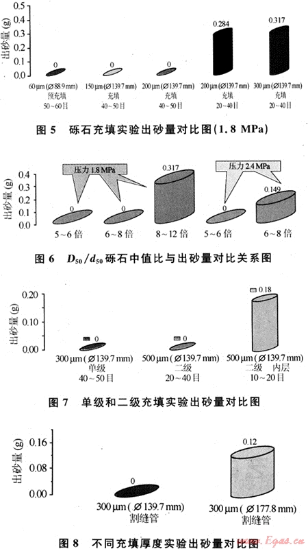 從試驗結(jié)果可以看出:①相同生產(chǎn)壓差下,充填礫石尺寸越大越容易出砂;對于相同尺寸的礫石,降低生產(chǎn)壓差可以減少出砂甚至不出砂;在兩種壓差下,D50/d50比值為5~6倍時,出砂量為零,提高壓差,在不出砂的條件下單位采氣指數(shù)略有增高。②對礫石充填防砂,防砂效果與充填厚度有關(guān),厚度太小或?qū)е路郎笆。瑐鹘y(tǒng)理論認為充填厚度應(yīng)大于20mm,盡可能保證充填厚度大于30mm;兩級充填時的防砂效果主要決定于外層礫石,采用多級防砂時,若要防止砂產(chǎn)出,應(yīng)盡可能增加外層礫石的充填厚度。