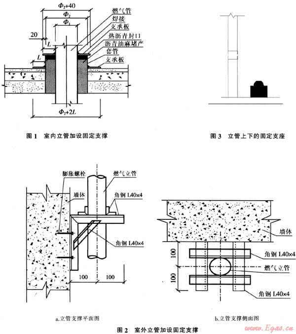 高層建筑物的樓層數(shù)較多,燃?xì)饬⒐艿拈L度也較長,管道的自重較重,產(chǎn)生的壓應(yīng)力很大。為了使整個(gè)立管自重能均勻分?jǐn)?,?yīng)在建筑物中每隔一定的距離設(shè)置管道的固定支架,使固定支架與建筑物成為一體,以減少立管底部壓縮應(yīng)力過于集中,防止因管道下沉而引起引入管受力折斷或變形引起倒坡。一般固定立管的做法有:
