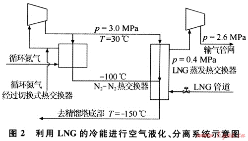 華東地區(qū)由于經濟發(fā)展的需要,所需液氮、液氧、液氬數(shù)額巨大,盡管滬寧一帶空分液體設備眾多,但仍出現(xiàn)供應緊張的情況。由于氧氮沸點分別為-183℃和-196℃,空氣液化所需溫度較低。隨著溫度降低其消耗的電能將急劇增加,要求的功將快速增加,機械效率將很低。因此選擇利用LNG冷能的工藝過程應充分利用其-160℃的低溫。LNG冷能的利用建議首選空氣分離和液化。