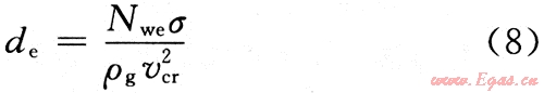 橢球體液滴韋伯?dāng)?shù)的臨界值為20~30。當(dāng)氣體流速大到足以使韋伯?dāng)?shù)達(dá)到臨界值時(shí),速度壓力起主要作用,液滴就容易破壞。取韋伯?dāng)?shù)為Nwe=30回代到式(7),解出最大液滴的直徑(de),即