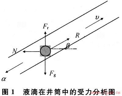 利用牛頓定律建立液滴運(yùn)動(dòng)方程。液滴在井筒中的受力只有4個(gè):重力、浮力、曳力和阻力。其受力分析見(jiàn)圖1。