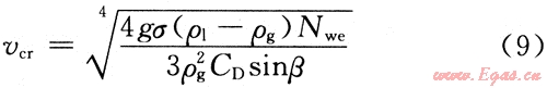 將式(8)的de代入式(6),則攜帶最大液滴的最小氣體流速為: