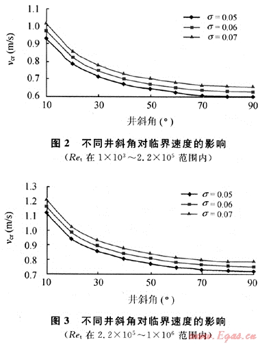圖2、圖3分別描述了不同表面張力下井斜角與臨界速度的關(guān)系。由于定向氣井中井斜角的存在,使得定向氣井的臨界攜液產(chǎn)量要比直井臨界攜液產(chǎn)量大得多;同時(shí)隨著井斜角度的增大,氣井的臨界攜液產(chǎn)量逐漸減小,當(dāng)井斜角為直角時(shí),氣井的臨界產(chǎn)量符合直井的臨界產(chǎn)量。