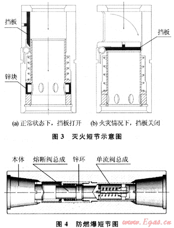 滅火短節(jié)(見圖3、圖4),即鉆柱防火接頭,這是一種低熔點(diǎn)合金制造的閥件,即滅火浮閥,閥內(nèi)裝有一個(gè)鋅環(huán)。在正常情況下,循環(huán)的空氣流動壓力使彈簧瓣向下張開,允許空氣循環(huán)通過。一旦環(huán)空著火,溫度上升,當(dāng)超過設(shè)計(jì)溫度時(shí),低熔點(diǎn)合金鋅環(huán)熔化使一個(gè)襯套封住空氣流道,關(guān)閉閥門,停止向井底循環(huán)補(bǔ)充空氣,從而切斷氣源使火熄滅。