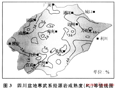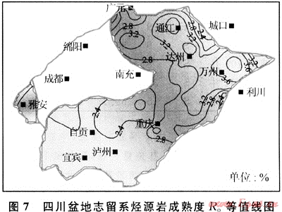 四川盆地下志留統(tǒng)泥質(zhì)烴源巖Ro值為2.2%~4.0%,已演化至過成熟階段。川南地區(qū)成熟度較低,普遍小于2.8%(圖7)。晚二疊世末,志留系源巖Ro值演化至0.9%,開始進入成油期。三疊紀(jì)之后,由于沉積速度加快,志留系埋藏速率也相應(yīng)加快,志留系烴源巖在壓力和溫度作用下,熱演化加速。到中三疊世末時,很多地區(qū)的Ro值已迅速演化至1.3%。志留系烴源巖生成大量的液態(tài)烴。中侏羅世后,沉積作用仍然快速進行,志留系地層仍處于快速埋藏狀態(tài),Ro值從1.3%迅速演化至2.2%,有機質(zhì)演化至高成熟期,處于濕氣轉(zhuǎn)化階段。從白堊系開始,大部分地區(qū)的志留系烴源巖有機質(zhì)R。值都超過了3%,進入過成熟期,主要形成干氣。