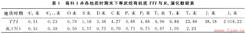 根據(jù)高科1井的沉積埋藏史圖(圖4)可見,樂山-龍女寺古隆起區(qū)下寒武統(tǒng)源巖經(jīng)歷了埋藏-抬升(剝蝕)-再埋藏-再抬升的演化過程。其有機質(zhì)生烴史可分為三期:第一期為初始生烴階段:高科1井下寒武統(tǒng)源巖在志留紀(jì)末R。值已達(dá)0.7%,處于未成熟一低成熟生烴期;第二期為生烴停滯階段,由于加里東運動的抬升作用,該井下寒武統(tǒng)源巖埋深變淺并遭受剝蝕,古地溫降低,有機質(zhì)進入生烴滯流階段;第三期為“二次生烴”階段:從二疊系開始至二疊系末,下寒武統(tǒng)源巖埋藏深度及其所具有的古地溫已超過了初始生烴階段,源巖進入了二次生烴階段。此時,高科1井毛。源巖Ro值已達(dá)0.71%,有機質(zhì)開始繼續(xù)生烴。印支末期,高科1井