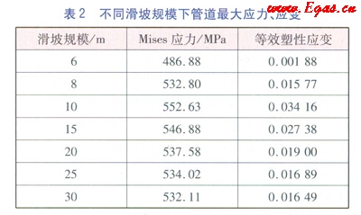 計(jì)算滑坡規(guī)模分別為6m、8m、10m、15m、20m、25m和30m工況下管道的最大Mises應(yīng)力和最大等效塑性應(yīng)變(見表2),隨著滑坡規(guī)模的不斷擴(kuò)大,管道沿滑坡體滑動方向的應(yīng)力、應(yīng)變逐漸增加,當(dāng)滑坡規(guī)模達(dá)到一定程度后,管道的應(yīng)力、應(yīng)變趨于穩(wěn)定并開始降低。該現(xiàn)象可以解釋當(dāng)滑坡規(guī)模較大時(shí),管道的彎曲程度減緩,使得彎曲應(yīng)力降低,一定程度上減小了組合應(yīng)力。