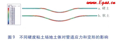 為分析滑坡兩側(cè)場地土體的影響,以滑坡規(guī)模20m為例,其他計(jì)算參數(shù)不變,分別計(jì)算硬土和軟土條件下管道的受力情況,硬土和軟土的剪切強(qiáng)度分別取50kPa和35kPa,如圖9所示,當(dāng)場地土體為軟土(圖9-b)時(shí)管道橫向位移發(fā)生范圍較長。