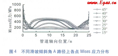 將滑坡規(guī)模固定為25m,滑坡傾斜角分別為15°、20°、25°、30°、35°、40°和45°,A路徑上各點(diǎn)的Mises應(yīng)力值見圖4。不同傾斜角下,管道的應(yīng)力集中區(qū)均為管道兩端和中下部。但隨著滑坡傾斜角的增加,管道的三個(gè)應(yīng)力集中區(qū)范圍逐漸增大,特別是管道中段的應(yīng)力集中區(qū)向兩端延伸,且最大應(yīng)力值也隨之增加。