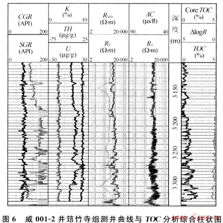 如前所述,隨深度的增加,筇竹寺組和龍馬溪組頁(yè)巖的顏色均具有自上而下逐漸加深的特點(diǎn),而其自然伽馬值和有機(jī)質(zhì)豐度也隨之逐漸增高(圖6)。威001-2是威遠(yuǎn)構(gòu)造上的一口新井,筇竹寺組的伽馬值在3175m以下明顯增加,一般都大于150API,而無(wú)論是根據(jù)測(cè)井曲線△㏒R(Passey,1989)計(jì)算的還是采用巖屑實(shí)測(cè)的TOC值,均顯示在該深度段以下一般都大于1.0%且逐漸增加的特征(圖6)。長(zhǎng)寧構(gòu)造上最近由中石油北京勘探開(kāi)發(fā)研究院鉆探的1口淺井也顯示出龍馬溪組頁(yè)巖所具有的上述特征。該口淺井鉆遇了龍馬溪組中下部黑色頁(yè)巖層,110m深度段以上的TOC值一般在1.5%~2.5%之間,該深度以下TOC值劇增,均大于3%,最高約9%。
