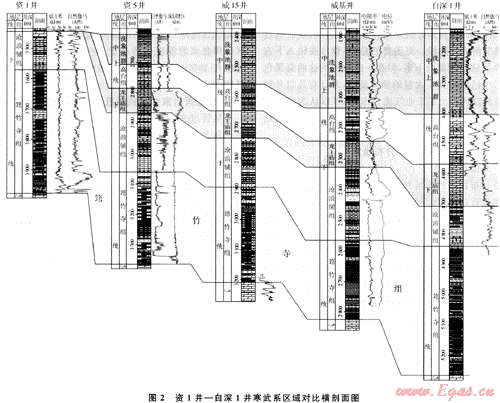 該組厚度一般分布在300~500m,由古隆起軸部向南北兩側(cè)增厚,厚者在750(強(qiáng)1、曾1井)~950m(寧2井)。威遠(yuǎn)-資陽(yáng)地區(qū)的筇竹寺組厚度一般在300~500m之間。筇竹寺組頂界埋深一般在4~5km,僅威遠(yuǎn)地區(qū)小于3km,而川東地區(qū)埋深較大,一般大于5km。
