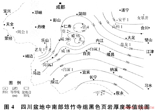 下古生界黑色頁(yè)巖集中分布在下寒武統(tǒng)筇竹寺組、下奧陶統(tǒng)大灣組和五峰組及下志留統(tǒng)龍馬溪組等4個(gè)層段中。大灣組(或大乘寺組)黑色頁(yè)巖在盆地西南部較發(fā)育,其厚度一般在45~140m,特別是在威遠(yuǎn)地區(qū)分布穩(wěn)定,也是未來(lái)下古生界頁(yè)巖氣勘探值得重視的一套目的層。五峰組黑色頁(yè)巖雖分布穩(wěn)定,但厚度較薄,一般只有幾米,且與龍馬溪組整合接觸,特征類似。限于資料,筆者僅針對(duì)筇竹寺組和龍馬溪組兩套黑色頁(yè)巖開(kāi)展分析與討論。