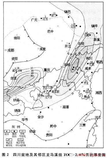 基于TOC含量是頁巖氣藏形成最基本的地質要素觀點,編制的TOC>2.0%的黑色頁巖累計厚度等值圖說明了以下幾點:①川東石柱-鄂西利川、川南瀘州和川北鎮(zhèn)巴地帶是四川盆地下志留統龍馬溪組海相頁巖最發(fā)育,也是頁巖氣藏形成最有利分布區(qū);②四川盆地及其鄰區(qū)下志留統龍馬溪組海相頁巖有機質豐度分布高值區(qū)(即優(yōu)質源巖發(fā)育區(qū))明顯受控于海灣深水陸棚沉積相體系,表明有利沉積相帶控制優(yōu)質烴源巖韻發(fā)育。