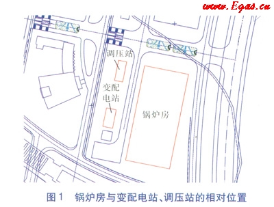 鍋爐房與變配電站、調(diào)壓站的相對(duì)位置見(jiàn)圖1,鍋爐房平面布置見(jiàn)圖2。