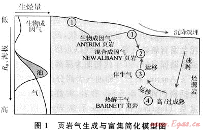 頁巖氣生烴過程與常規(guī)油氣并無區(qū)別,但儲集方式、富集條件以及氣藏宏觀分布差異較大。從天然氣賦存狀態(tài)來看,頁巖氣包含了吸附氣部分,并且不同地質(zhì)條件下游離氣、吸附氣二者相對含量變化大,開采方案、生產(chǎn)曲線也呈現(xiàn)不同特征;從油氣成藏動力條件以及宏觀特征上看,常規(guī)油氣運移過程中需要上傾方向存在與輸導(dǎo)體系相關(guān)的構(gòu)造高部位,離散分布的低勢能區(qū)域是成藏有利目標(biāo),浮力是天然氣運移的主要動力,天然氣不斷運聚,氣水界面隨之下移,所以下傾方向往往是水層,而連續(xù)式富集的頁巖氣鮮受水動力影響,多區(qū)域性分布于坳陷中[12],如Appalachian、Michigan和Illinois盆地泥盆系含氣頁巖覆蓋面積約71200km2,屬于自生自儲巖性氣藏,沒有明顯的氣水界面。