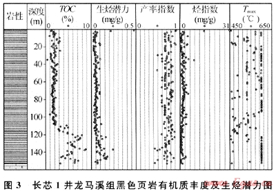 對上揚子地區(qū)下志留統(tǒng)龍馬溪組有機碳含量統(tǒng)計,發(fā)現(xiàn)下志留統(tǒng)龍馬溪組有機碳含量變化大,分布在0.1%~8.65%之間,多數(shù)大于1%。長寧-珙縣地區(qū)鉆探的長芯1井,通過對龍馬溪組下部黑色頁巖153m連續(xù)取心的有機碳含量分析(圖3)同樣反映出這種變化特征。在110m以淺,TOC含量處在1%~3%之間,平均為2%,110~153m井段(龍馬溪組最底部)TOC均大于2%,平均值可達到6%。全井段統(tǒng)計,TOC>2.0%的累計厚度可達80m,主要分布于龍馬溪組下段(包括上奧陶統(tǒng)約10m的五峰組碳質(zhì)頁巖),這將是形成頁巖氣藏最有利層段。