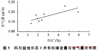 頁巖氣的勘探生產(chǎn)價值取決于其中游離氣和吸附氣的含量,游離氣的含量高低與其構(gòu)造保存條件密切相關,而吸附氣含量受溫度、壓力等環(huán)境因素影響,在相同情況下,吸附氣量高低與有機質(zhì)含量呈正相關。上揚子地區(qū)志留系烴源巖有機質(zhì)豐度高,預計將會在構(gòu)造保存條件差異較大的地區(qū)分別形成不同含氣量及含氣特點的頁巖氣聚集。在四川盆地,除已發(fā)現(xiàn)過去的老井在鉆探志留系頁巖段時具有豐富的氣顯示之外,目前完鉆的長芯1井初步分析結(jié)果顯示,在埋深淺于150 122龍馬溪組頁巖層段內(nèi),同樣發(fā)現(xiàn)了頁巖氣存在的證據(jù)(表2)。8個頁巖巖心的含氣量實驗結(jié)果顯示(解析溫度70℃),每噸巖石含氣量為0.08~0.25m3,平均為0.15m3/t。另從110m和120m巖樣的甲烷碳同位素分別為-40.2‰和-52.3‰來看,頁巖氣應為熱成因的天然氣。有機質(zhì)豐度與含氣量的關系則顯示(圖5),同美國頁巖一樣,同樣具有有機碳含量與含氣量呈正相關的關系,即有機質(zhì)豐度越高,含氣量越大。