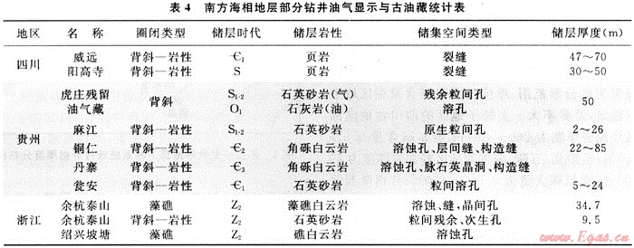 5) 鉆井天然氣顯示:不完全統(tǒng)計,早期在常規(guī)油氣勘探過程中,在100口余鉆井中見到天然氣顯示或露頭發(fā)現(xiàn)古油藏及頁巖氣顯示(表4)。據(jù)四川盆地威遠(yuǎn)地區(qū)36口鉆井統(tǒng)計,筇竹寺組頁巖有30口井發(fā)現(xiàn)氣顯示,志留系龍馬溪組13口井中有10口見氣顯示。威遠(yuǎn)地區(qū)的威5、威9、威18、威22和威28等井下寒武統(tǒng)泥頁巖均見氣侵井涌和井噴,其中威5井下寒武統(tǒng)筇竹寺組2795~2798m頁巖井段發(fā)現(xiàn)氣侵與井噴,中途測試日產(chǎn)氣2.46×104m3,酸化后日產(chǎn)氣1.35×104m3。川東南地區(qū)陽高寺構(gòu)造帶的陽深2、宮深1、付深1、陽63、陽9、太15和隆32等井在下志留統(tǒng)龍馬溪組多處發(fā)現(xiàn)氣顯示,其中陽63井下志留統(tǒng)龍馬溪組3505~3518.5m黑色頁巖段,酸化后獲日產(chǎn)氣3500m3,隆32井下志留統(tǒng)龍馬溪組3164.2~3 175.2m黑色碳質(zhì)頁巖段獲日產(chǎn)氣1948m3。另外,20世紀(jì)70年代中期在貴州大方地區(qū)鉆探的方深1井,在下寒武統(tǒng)牛蹄塘組也發(fā)現(xiàn)良好氣顯示。該井下寒武統(tǒng)牛蹄塘組鉆遇井深1686~1785m,厚99m,巖性上部為一套深灰色含碳質(zhì)粉、細(xì)砂巖與碳質(zhì)頁巖互層,中-下部為黑色碳質(zhì)頁巖。有機(jī)碳含量2.97%~8.02%;氯仿瀝青“A”含量0.087%~0.11%,成熟度為高-過成熟。鉆井中,在1723.4~1726.7m井段見氣測異常,泥漿見雨狀氣泡,含氣38%,點燃呈藍(lán)色火焰,下伏震旦系全井段氣測異常,電測解釋6個含氣層、3個可能含氣層。