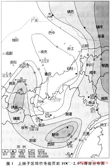 據(jù)Charles Boyer等(2006)[5]把源巖有機(jī)質(zhì)豐度定為6級,即TOC<0.5%為很差;0.5%~1%為差;1%~2%為一般;2%~4%為好;4%~12%為很好;TOC>12%為極好。美國從事頁巖氣藏勘探開發(fā)的油公司一般將有效頁巖TOC含量下限值確定為2.0%。筆者采用這一下限值,并依據(jù)上揚子區(qū)下寒武統(tǒng)筇竹寺組頁巖TOC含量實測標(biāo)定資料及相應(yīng)厚度分布,編制了該區(qū)筇竹寺組頁巖TOC≥2.0%的頁巖厚度分布圖(見圖1)。