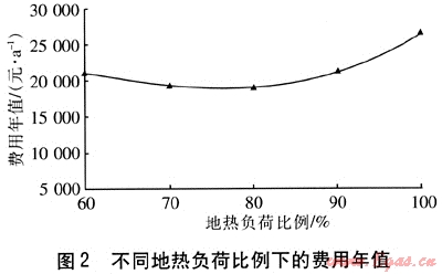 選取適中的地埋管回水溫度(30℃)、地埋管外徑(25mm),不同地?zé)嶝?fù)荷比例下的費(fèi)用年值見圖2。由圖2可知,采用適中的地?zé)嶝?fù)荷比例,可獲得較低的費(fèi)用年值。通過分析計(jì)算,不同供回水溫差、地埋管外徑下均存在類似的規(guī)律,因此可以確定地?zé)嶝?fù)荷比例為80%時(shí),系統(tǒng)的經(jīng)濟(jì)性最好。