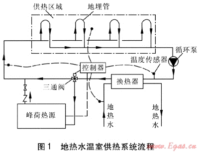 地?zé)崴疁厥夜嵯到y(tǒng)流程(見圖1)由換熱器、地埋管、峰荷熱源、循環(huán)泵、溫度傳感器、控制器、三通閥等組成。換熱器將地?zé)崴c供熱介質(zhì)隔開,防止地?zé)崴畬?duì)供熱管道的腐蝕及結(jié)垢。地埋管安裝在溫室內(nèi)地面下,向溫室散熱??刂破髟诓杉覂?nèi)溫度、供熱介質(zhì)供回水溫度和地?zé)崴疁囟葦?shù)據(jù)的基礎(chǔ)上,進(jìn)行分析計(jì)算,控制三通閥的啟閉和峰荷熱源工作狀態(tài),調(diào)節(jié)補(bǔ)充熱量,滿足供熱要求。在設(shè)計(jì)地?zé)崴疁厥夜嵯到y(tǒng)時(shí),需要掌握的地?zé)峋畢?shù)為:地?zé)崴疁囟?、水量、水位、水質(zhì)狀況。地?zé)崴疁囟?、水量可以確定地?zé)崴淖畲蠊嶝?fù)荷,地?zé)崴挥糜跐撍玫倪x型,水質(zhì)狀況用來判斷地?zé)崴母g結(jié)垢趨勢(shì)。