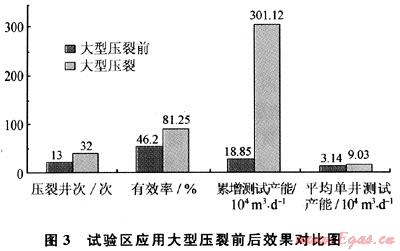 該氣藏通過大型壓裂,獲得了顯著的增產(chǎn)效果及較高的開采效益,圖3是該氣藏應(yīng)用大型壓裂前后效果對(duì)比圖。