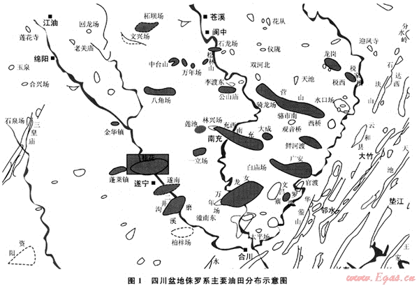 四川盆地雖以產(chǎn)氣為主,但至今仍在盆地內(nèi)發(fā)現(xiàn)了柘壩場(chǎng)、金華鎮(zhèn)、秋林、中臺(tái)山、石龍場(chǎng)、八角場(chǎng)、公山廟、充西-蓮池、桂花、一立場(chǎng)、稅家槽、鮮渡河等油田(圖1)。在四川盆地中部(川中)侏羅系中自下而上發(fā)現(xiàn)了珍珠沖段、東岳廟段、大安寨段、涼高山組、沙溪廟組5個(gè)含油層段,其中大安寨段、涼高山組和沙溪廟組為主力產(chǎn)油層。川西南部和中部在侏羅系地層中發(fā)現(xiàn)了新場(chǎng)、洛帶、平落壩、大興西等氣田,川西北部侏羅系露頭發(fā)現(xiàn)了油砂巖[1]。1950~1960年間在江油海棠鋪構(gòu)造所鉆井至今井口仍有少量原油產(chǎn)出。川東地區(qū)在侏羅系鉆井中也頻見油氣顯示,新5井日產(chǎn)原油36t[2]。川東北渡口河、五寶場(chǎng)地區(qū)于侏羅系上沙溪廟組亦發(fā)現(xiàn)氣藏并投入開發(fā)。為此,研究了四川盆地侏羅系的油氣成藏條件。