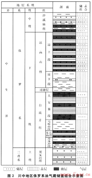 川中地區(qū)侏羅系儲(chǔ)層多層段分布,珍珠沖段砂巖、東岳廟段石灰?guī)r、大安寨段石灰?guī)r、涼高山組砂巖及沙溪廟組砂巖構(gòu)成了重要的產(chǎn)油層。沙溪廟組、蓬萊鎮(zhèn)組是川西南部侏羅系主要?dú)鈱樱淮|北地區(qū)目前主要在上沙溪廟組獲得氣藏。