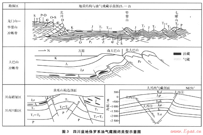 總之,除在龍門山?jīng)_斷帶、大巴山?jīng)_斷帶及華鎣山?jīng)_斷帶上升盤中生代和古生代地層遭到強(qiáng)烈剝蝕不具備封蓋和保存條件,逆沖大斷裂下降盤侏羅系地層上傾方向與具壓性特點(diǎn)的斷裂相接,可構(gòu)成構(gòu)造-巖性圈閉以外,盆內(nèi)大部分地區(qū)都主要以巖性圈閉、構(gòu)造(裂縫)-巖性圈閉為主(圖3)。油氣橫向運(yùn)移受到制約,斷裂及其伴生裂縫成為油氣就近運(yùn)移、就近捕獲的重要通道或載體,裂縫有利于油氣的富集。