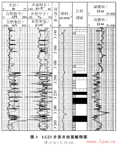 LG23井,試驗(氮氣)井段3130.00~3683.00m。該井用自動取樣裝置所取巖樣(每4m取1個樣)建立的錄井剖面,與測井解釋剖面符合率為87%(圖3)。