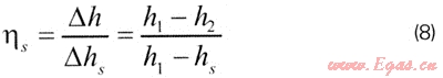 在透平膨脹機(jī)中,標(biāo)志能量轉(zhuǎn)換過程完善程度的指標(biāo)就是效率。從理論上來說,膨脹工質(zhì)在給定的進(jìn)、出口條件下可能實(shí)現(xiàn)的最大比焓降應(yīng)為等熵比焓降△hs,因此等熵比焓降是一個比較的標(biāo)準(zhǔn)。透平膨脹機(jī)進(jìn)、出口實(shí)際比焓降△h與等熵比焓降之比稱為等熵效率[14]: