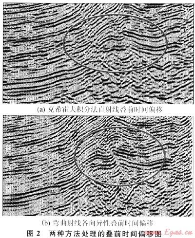 克?;舴蚍e分法疊前時(shí)間偏移,考慮了復(fù)雜陡傾界面的地層傾角及反射點(diǎn)彌散問題,能部分適應(yīng)速度在縱橫向的變化[4]。由于沒有考慮射線彎曲,所以在速度縱向變化較時(shí)偏移效果不理想彎曲射線各向異性疊前時(shí)間偏移,由于它考慮了成像射線的彎曲及速度各向異性,更符合地下實(shí)際,成像效果明顯優(yōu)于直射線疊前時(shí)間偏移,在斷層成像、斷塊劃分能力以及目的層內(nèi)幕反射特征上有很大的改善(圖2)。