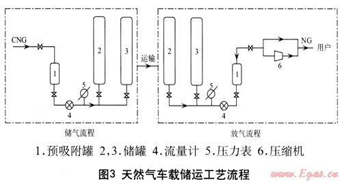 天然氣車載儲運(yùn)工藝中,在儲放氣流程均設(shè)置了預(yù)吸附罐,其體積為吸附儲罐的1/100~1/50,內(nèi)裝吸附劑,其作用是在儲放氣過程中起到緩沖作用;同時(shí)在儲氣過程中,預(yù)吸附天然氣的部分雜質(zhì),延長儲罐中吸附劑的使用壽命;在放氣過程中,天然氣反沖過預(yù)吸附罐,使吸附的雜質(zhì)脫附。預(yù)吸附罐內(nèi)的吸附劑定期更換再生。如圖3為設(shè)計(jì)的天然氣車載儲運(yùn)的工藝流程。