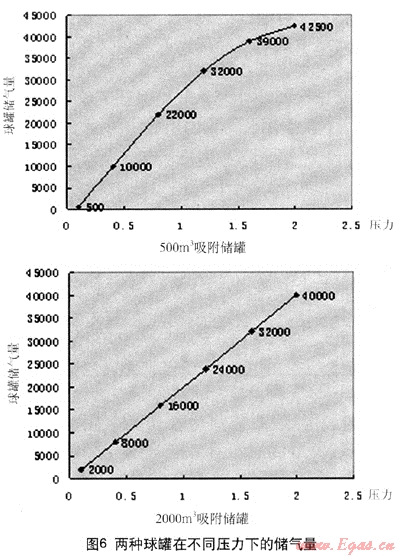 圖6是兩種球罐從常壓0.1MPa至2MPa時(shí)每個(gè)壓力時(shí)所對應(yīng)的儲氣量,而用氣調(diào)峰最高量時(shí),球罐內(nèi)壓力會在最高2MPa降到接近輸氣管道常壓左右,即500m3吸附球罐大概可釋放出42000m3天然氣用于調(diào)峰,而2000m3壓力球罐則可釋放38000m3的天然氣,所以在調(diào)峰量上500m3吸附球罐是完全可代替2000m3的壓力球罐。而以每戶每月平均用氣量按45m3計(jì)算,則平均每天用氣1.5m3。按城市燃?xì)獾恼{(diào)峰量30%計(jì)算,每日每戶總調(diào)峰量約為0.5m3,晚上7~9點(diǎn)時(shí)調(diào)峰量約為0.25m3,則一個(gè)500m3的儲罐可解決17萬戶居民的用氣量日調(diào)峰問題。