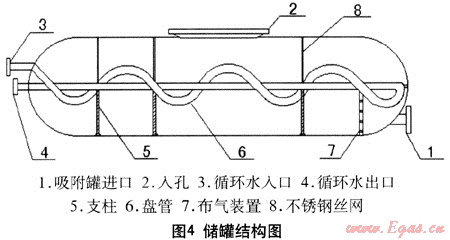 如圖4所示,本項(xiàng)目采用內(nèi)置盤管的天然氣儲罐,盤管內(nèi)采用冷卻水為介質(zhì)。在儲氣時(shí),盤管內(nèi)通入冷卻水,降低吸附劑床層的溫度,提高吸附劑的吸附性能;放氣時(shí),盤管內(nèi)通入熱水,提高吸附劑床層的溫度,提高吸附劑的有效吸附量。