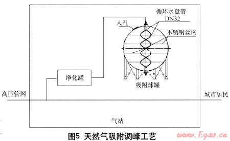吸附儲氣調(diào)峰的工藝主要流程是:首先天然氣從上級高壓管網(wǎng)輸送到氣站,然后在氣站中經(jīng)降壓、加臭和計(jì)量等處理,再送到每家用戶供給使用。氣站中天然氣經(jīng)降壓處理前,管道會跟調(diào)峰罐連接起來,調(diào)峰罐會根據(jù)其天然氣管道的壓力狀況來進(jìn)行調(diào)峰處理,從而保證了城市居民的用氣穩(wěn)定。整個(gè)工藝的流程如圖5所示。